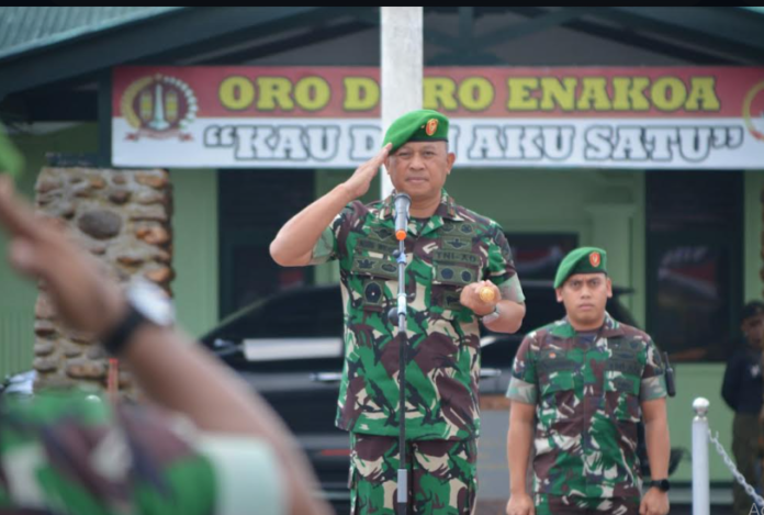 KORANBOGOR.com,JAKARTA-Di lapangan upacara Makodim 1710/Mimika, Distrik Kuala Kencana, Danrem 174/ATW, Brigjen TNI Agus Widodo, S.IP., M.Si memimpin apel gelar pasukan dalam rangka kesiapan pengamanan Pemilu 2024, Rabu (08/11/2023).