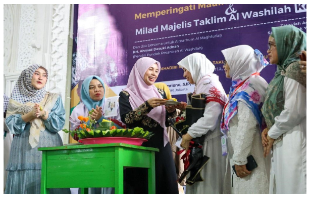 Tanpa canggung, mantan wartawan itu membalas setiap sapaan dan ajakan salaman dari para santriwati maupun ibu-ibu anggota Majelis Taklim Al Washilah.