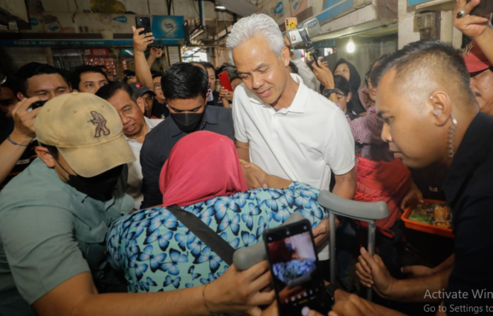 KORANBOGOR.COM.BALIKPAPAN. Calon Presiden (capres) nomor urut 3, Ganjar Pranowo, blusukan ke Pasar Baru Balikpapan, Kalimantan Timur (05/12).