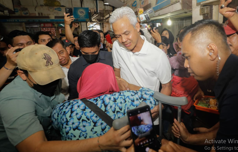Ganjar kemudian menyambangi sebuah kios penjual sayur-sayuran dan cabai. Capres berambut putih ini kemudian berdialog dengan pedagang di kios tersebut yang bernama Katini.