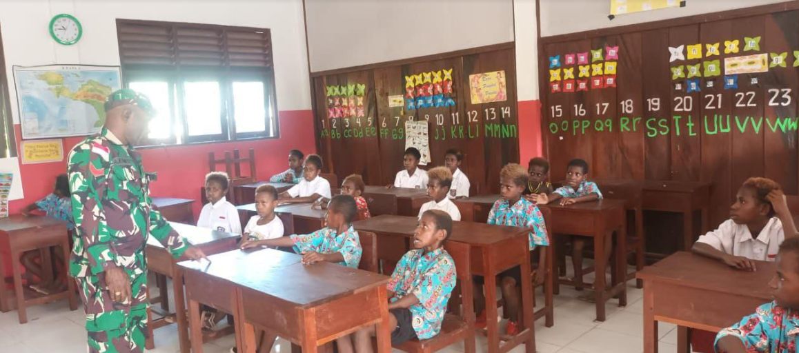 KORANBOGOR.com,TIMIKA-Dalam rangka menanamkan rasa cinta tanah air kepada generasi penerus guna meningkatkan wawasan,khususnya keikutsertaan dalam menjaga keutuhan Negara Kesatuan Republik Indonesia (NKRI) sejak dini,Bintara Pembina Desa (Babinsa) Koramil 1710-03/Kuala Kencana Koptu Alfaris Kumiyu berkoordinasi dengan guru untuk memberikan pembekalan materi Wawasan Kebangsaan kepada siswa-siswi SD YPPK ST. Yakobus di Kp. Iwaka, Distrik Iwaka, Kab. Mimika, Sabtu (20/01/2024).