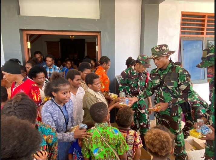 KORANBOGOR.com,YAHUKIMO-Satgas TMMD ke-119 Kodim 1715/Yahukimo memberikan kontribusi positif pada masyarakat setempat dengan melakukan program “Minggu Berkah”, dengan membagikan makanan kepada masyarakat yang selesai melaksanakan ibadah di Gereja Maranatha Dekai, Kab. Yahukimo, Papua Pegunungan, Minggu (25/02/2024).
