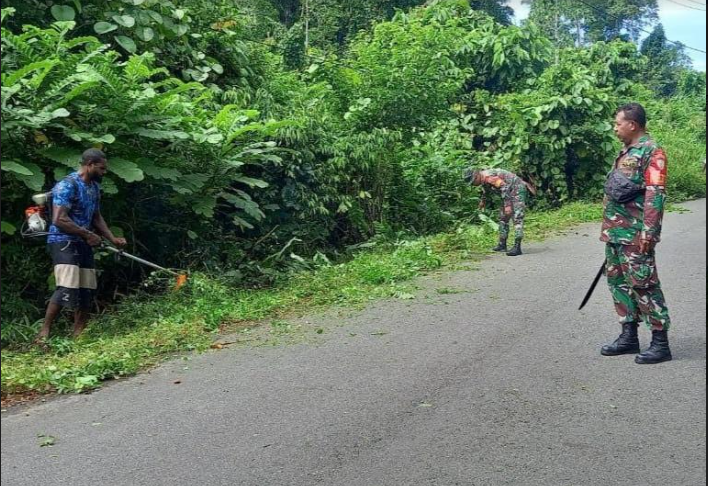 Seperti yang dilakukan oleh personel Babinsa Koramil 1710-07/Mapurujaya, Serma Fajar beserta tiga anggota Babinsa bersama masyarakat melaksanakan gotong royong pembersihan ruas kanan kiri jalan dan parit di Kampung Tipuka, Distrik Mimika Timur, Kab. Mimika, Selasa (19/3/2024).