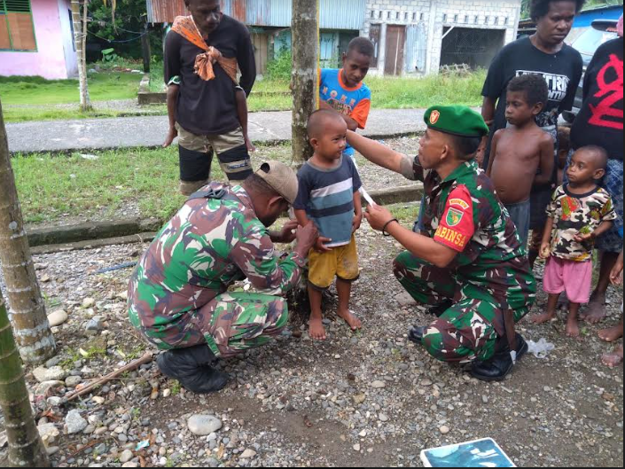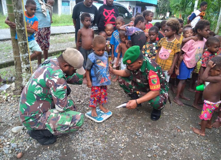 KORANBOGOR.com,TIMIKA-Babinsa Koramil 1710-07/Mapurujaya Kodim 1710/Mimika, Sertu Sufriadi dan Pratu Yakobus Kowet melaksanakan kegiatan Pemberian Makanan Tambahan (PMT) kepada anak-anak Kampung Mwuare, Distrik Mimika Timur, Kab. Mimika. Jumat (28/6/2024).