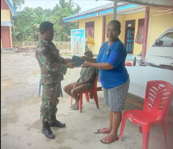 KORANBOGOR.com,TIMIKA-Bentuk toleransi dan kepedulian kepada warga binaan, Babinsa Koramil 1710-07/Mapurujaya dipimpin Peltu Khoirul Anwar menggelar Komsos sembari menyerahkan bantuan 50 buah Alkitab kepada Jemaat Gereja GPI Imanuel Mapurujaya, Distrik Mimika Timur, Kab. Mimika, yang secara simbolis diserahkan kepada Pdt. F. C Hukubun S. Si, Selasa (16/07/2024).