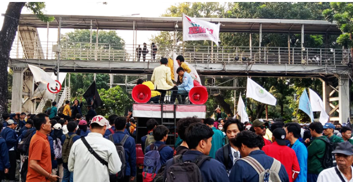 “Selama 10 tahun memimpin, Jokowi banyak menimbulkan masalah. Keluarganya disejahterakan, rakyatnya disengsarakan,” kata salah seorang orator lantang, dari atas mobil komando.