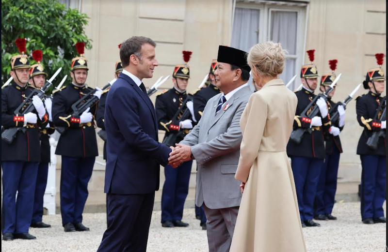 Terlihat Menhan Prabowo berjalan di karpet merah, dan berjabat tangan dengan Presiden Prancis beserta istri, Brigitte Macron.