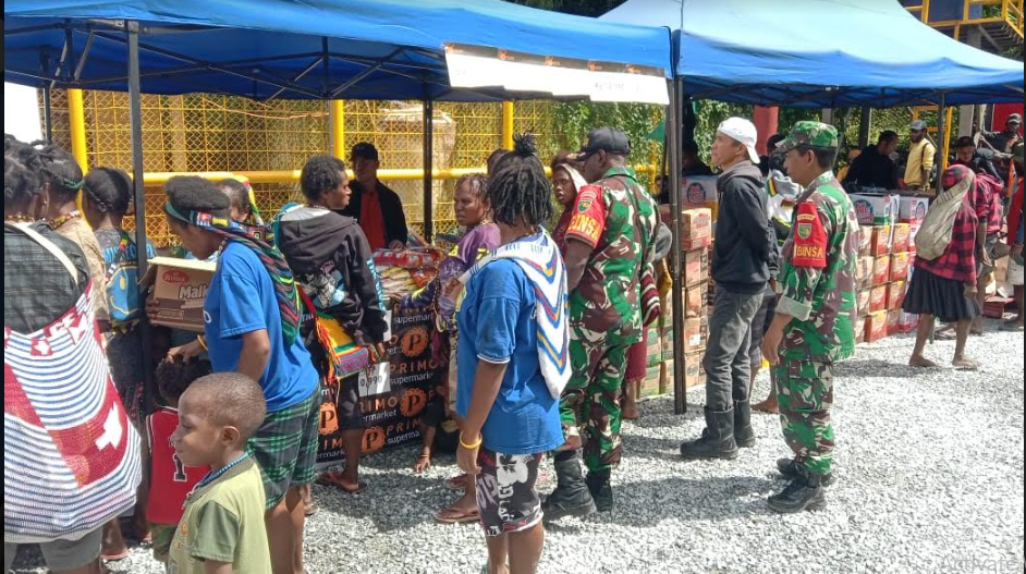KORANBOGOR.com,TIMIKA-Dalam rangka memeriahkan HUT RI ke-79 tahun 2024 dan memberikan pelayanan kepada masyarakat serta menjaga situasi aman dan kondusif di wilayah binaan, Koramil 1710-04/Tembagapura dipimpin Danramil Kapten Chb Eliazar Manuk Allo bersama personel satgas dan pihak Kepolisian bekerja sama dengan Primo dan Fun Game menggelar bazar untuk masyarakat, bertempat di Kp. Banti 2 Distrik Tembagapura, Kab. Mimika, Rabu (14/08/2024).