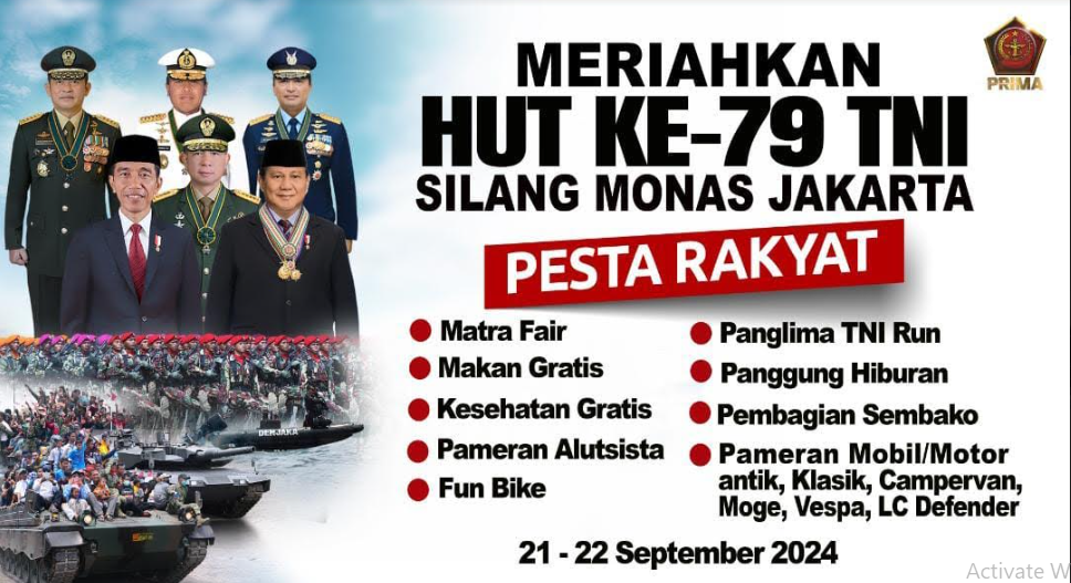 Dalam rangka memperingati HUT Ke-79 TNI, “Pesta Rakyat” akan digelar di Silang Monas, Jakarta, pada tanggal 21-22 September 2024.