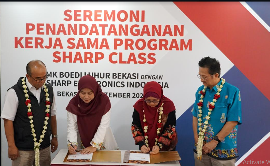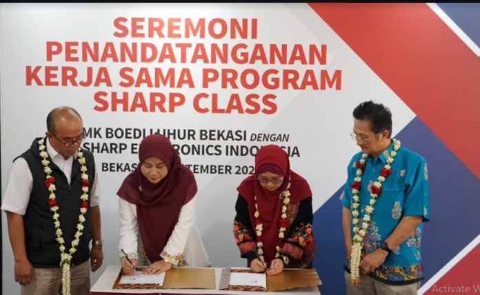Foto 1 : Perwakilan Sharp bersama perwakilan SMK Boedi Luhur Kabupaten Bekasi menandatangani MoU kerjasama program Sharp Class yang disaksikan oleh Dinas Pendidikan Provinsi Jawa Barat Wilayah III