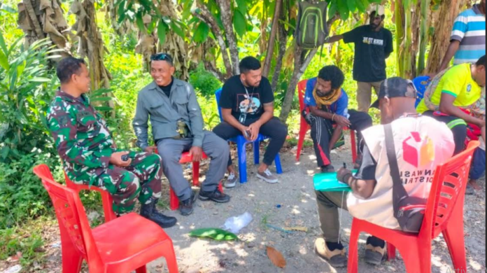 KORANBOGOR.com,TIMIKA-Dalam rangka menciptakan situasi yang aman dan kondusif pasca Pilkada 2024, Danramil 1710-07/Mapurujaya Lettu Inf Ahmad Saleh bersama Babinsa melaksanakan kegiatan monitor wilayah dan Komsos dengan warga di Kampung Ayuka, Distrik Mimika Timur, Kab. Mimika. Minggu (08/12/2024).