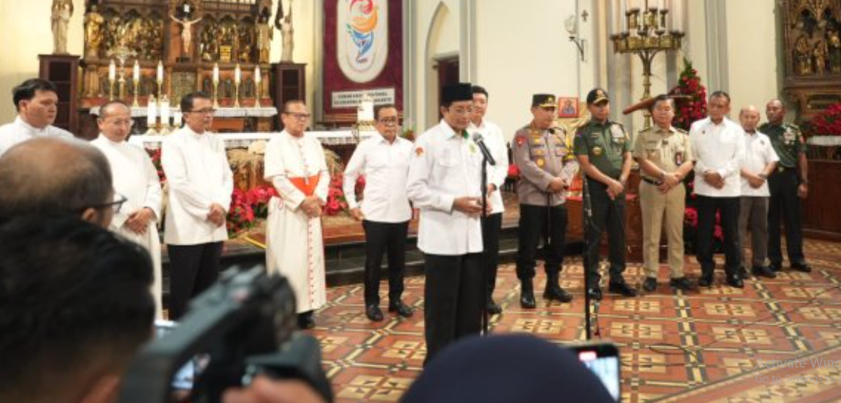 KORANBOGOR.com,JAKARTA-Menteri Agama Nasaruddin Umar meninjau sejumlah gereja di Jakarta bersama Menteri Koordinator Bidang Pembangunan Manusia dan Kebudayaan, Pratikno, serta Menteri Koordinator Bidang Politik, Hukum, dan Keamanan, Budi Gunawan, serta Kapolri Listyo Sigit. Menag menyapa umat Kristiani yang sedang menjalani Misa Natal di Gereja Katedral, Gereja Kristen Indonesia (GKI) Samanhudi, dan Gereja Protestan di Indonesia bagian Barat (GPIB) Immanuel Jakarta.