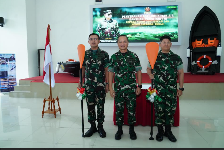 KORANBOGOR.com,BEKASI-Asisten Logistik (Aslog) Panglima TNI Mayjen TNI Candra Wijaya mewakili Panglima TNI Jenderal TNI Agus Subiyanto menyerahkan secara simbolis Alat Angkut Air Boat Polyetylene bantuan Panglima TNI dalam rangka Tanggap Penanggulangan Bencana Alam Banjir kepada Kepala Staf Kodim 0507/Kota Bekasi Letkol Czi Erlangga Perdana Gassing dan Komandan Kodim 0509/Kab. Bekasi Letkol Inf Danang Waluyo, bertempat di Aula Babinsa Makodim 0509/Kab. Bekasi, Jl. Boulevard Raya, Sukamahi, Cikarang Pusat, Kab. Bekasi, Jawa Barat, Senin (17/3/2025).