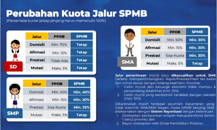 Berdasarkan catatan Kementerian Pendidikan Dasar dan Menengah (Kemendikdasmen), SPMB 2025 menyediakan empat jalur masuk bagi siswa/siswi, yaitu jalur domisili yang ditujukan bagi calon murid yang tinggal di dalam wilayah di sekitar sekolah yang dituju.