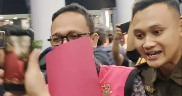 Foto: Tersangka kasus perintangan penyidikan, JS (Junaedi Saibih), digiring oleh penyidik Kejaksaan Agung menuju mobil tahanan di Gedung Kejaksaan Agung, Jakarta, Selasa (22/4/2025)