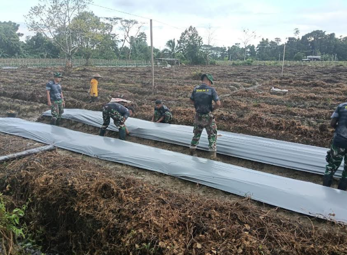 KORANBOGOR.com,TIMIKA-Personel Satgas TMMD 124 Kodim 1710/Mimika bersama warga dari Kelompok Tani (Poktan) “Noken Naena” melaksanakan pembersihan dan pemasangan Plastik Mulsa lahan ketahanan pangan untuk mengejar target tanam, bertempat di lokasi pembukaan lahan tidur di Kp. Nena Muktipura, Distrik Iwaka Kab. Mimika, Sabtu (24/05/2025).