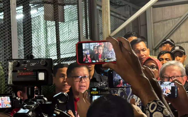 Sekjen Hasto keluar dari rutan dengan mengenakan jaket hitam dan kaos merah, disambut oleh kerabat serta kuasa hukumnya, termasuk Maqdir Ismail dan Febri Diansyah.