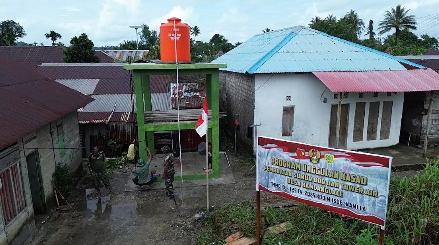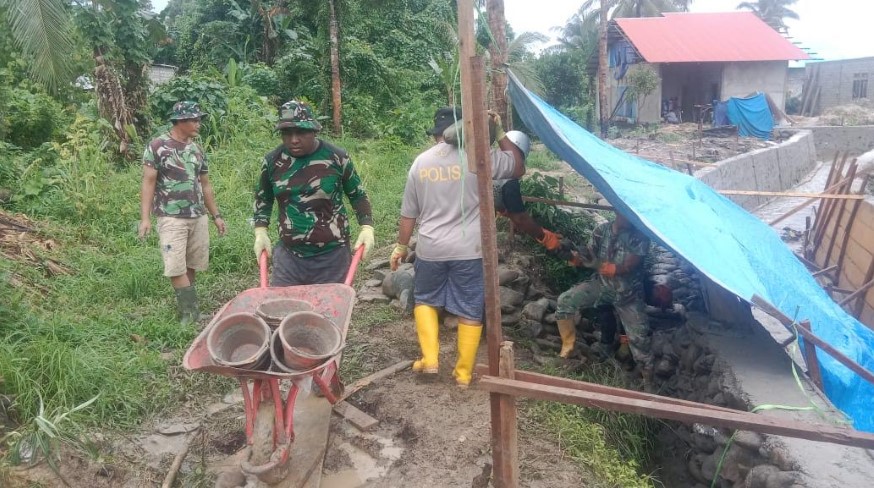 KORANBOGOR.com,BURU SELATAN-Hujan deras yang mengguyur wilayah Kabupaten Buru Selatan tidak melunturkan semangat Satgas TMMD 125 Kodim 1506/Namlea dalam melaksanakan kegiatan fisik pembuatan reol sepanjang 315,10 meter di Desa Waenono, pembuatan sumur bor dan tower air di Desa Kamanglale, serta rehab rumah tidak layak huni (RTLH) di Desa Leku.