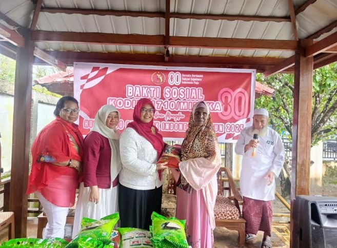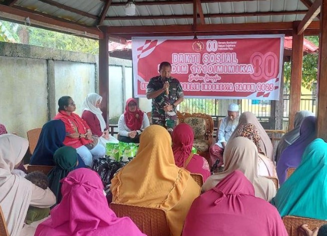 KORANBOGOR,com,TIMIKA-Dalam rangka menyambut HUT Kemerdekaan Republik Indonesia Ke-80 Tahun 2025, Kodim 1710/Mimika menggelar kegiatan bakti sosial berupa bantuan sembako kepada kaum Dhuafa dan Mualaf di Rumah Quran, Masjid Al Haq Kp. Pomako, Distrik Mimika Timur, Kab. Mimika, dipimpin langsung Dandim 1710/Mimika Letkol Inf M. Slamet Wijaya, S.Sos,.M.Han,.M.A dan Ketua Persit KCK Cab. XXXV Ny. Ulfa Slamet Wijaya, Rabu (13/08/2025).