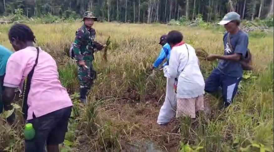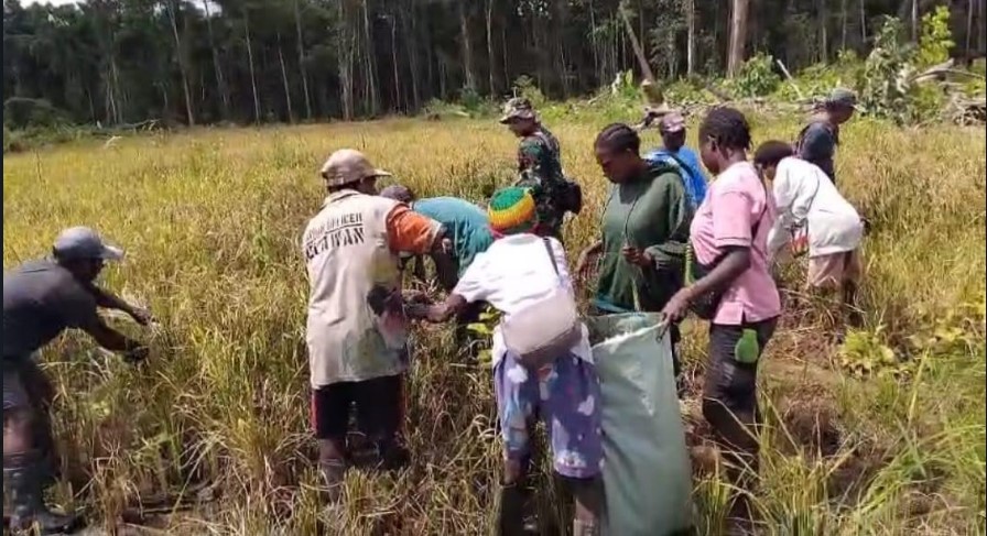 KORANBOGOR.com,TIMIKA-Dalam rangka mendukung ketahanan pangan sekaligus meningkatkan produktivitas pertanian, Pelda Safi’i bersama 4 Babinsa Koramil 1710-03/Kuala Kencana Kodim 1710/Mimika, bersama warga Kampung Iwaka dan Dinas Pertanian Kabupaten Mimika, melaksanakan panen padi gogo, Selasa (02/9/2025).