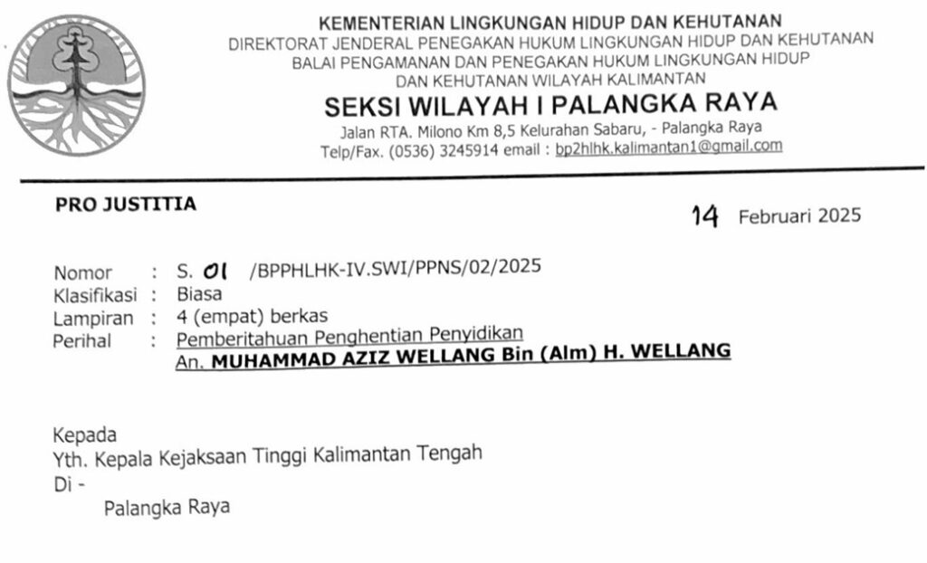 Adapun surat pemberitahuan dengan nomor S.01/BPPHLHK-IV.SWI/PPNS/02/2025 itu ditujukkan kepada Kepala Kejaksaan Tinggi Kalimantan Tengah