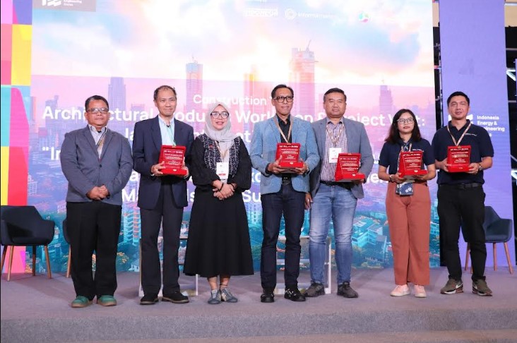 (Ki-ka) Tim Indonesia Construction Architecture Network, perwakilan Ikatan Arsitek Indonesia (IAI), Project Director PT Jakarta Propertindo (Jakpro) Arry Wibowo, Managing Director PDW Architects Prasetyoadi, Business Development Manager PT NS BlueScope Indonesia Krisna Wijanarko, dan Specification Manager PT NS BlueScope Lysaght Indonesia Stanislas Dinda hadir dalam program talkshow di Architectural Products Workshop & Stadium Visit: Jakarta International Stadium 2025.)