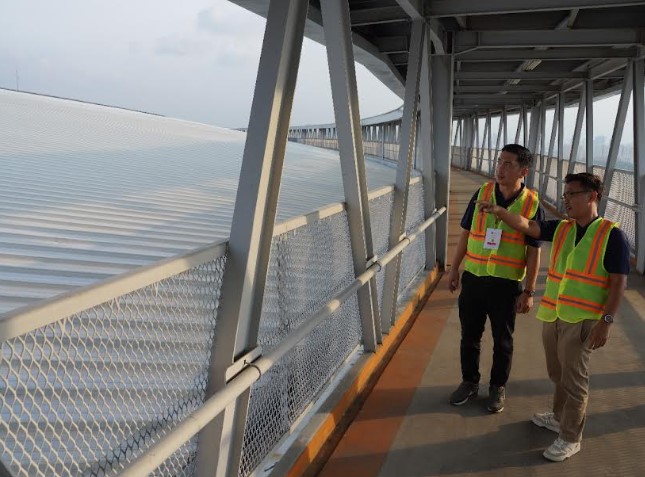 Foto 1a-b:(Ki-ka) Business Development Manager PT NS BlueScope Indonesia Krisna Wijanarko dan Solution Sales Manager Marketing PT NS BlueScope Lysaght Indonesia Achmad Basuni meninjau bangunan Jakarta International Stadium (JIS) dalam rangkaian acara Construction Indonesia 2025 di Jakarta. Atap bangunan JIS menggunakan material Colorbond® XAL dengan ketahanan korosi tinggi, sehingga cocok untuk bangunan di wilayah pesisir pantai.)