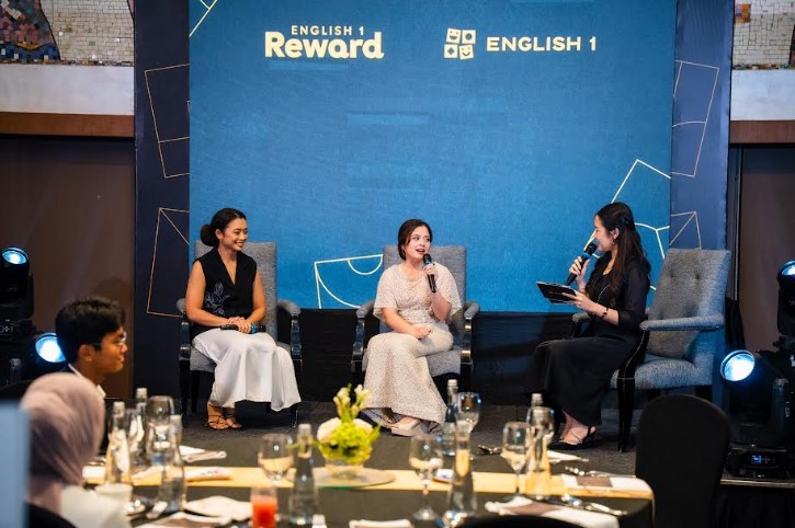 1. Marketing Director English 1, Rhea Danaparamita (paling kiri) dan mantan penyanyi cilik Tasya Kamila (tengah) saat berdiskusi di sesi talkshow di acara English 1, akhir pekan lalu.